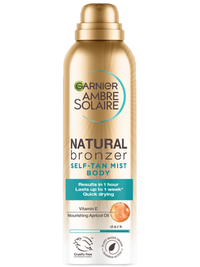 Achieve a natural looking tan with Garnier Ambre Solaire Natural Bronzer Self-tan Body Mist Dark, a quick-drying self tanning spray with nourishing apricot extract and Vitamin E. Results in one hour that last up to one week*.